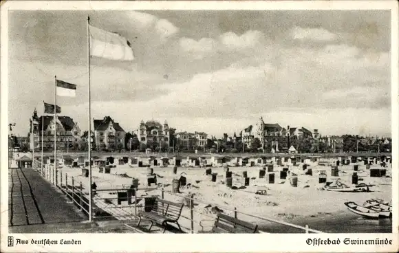 Ak Świnoujście Swinemünde Pommern, Sandstrand, Badseinrichtungen, Flaggen