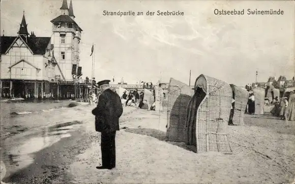 Ak Świnoujście Swinemünde Pommern, Strand an der Seebrücke, Strandkörbe