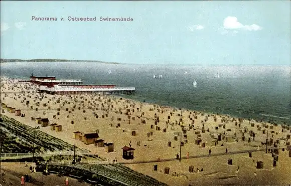 Ak Świnoujście Swinemünde Pommern, Strandpanorama, Meer, Strandkörbe