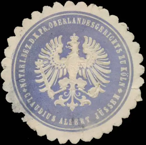im Bezirk des K. Oberlandesgerichts Köln, blau, weiß, geprägt, Größe/Zustand: 4 , beschädigt, Original Verschluss-Siegelmarke aus Papier welche früher von Behörden, Firmen etc. zum Versiegeln der Briefe benutzt wurden