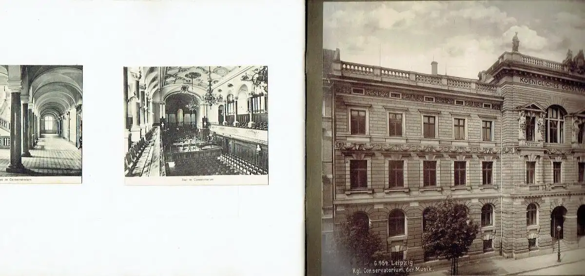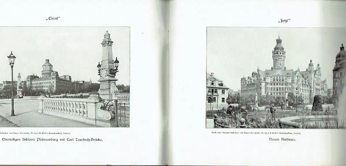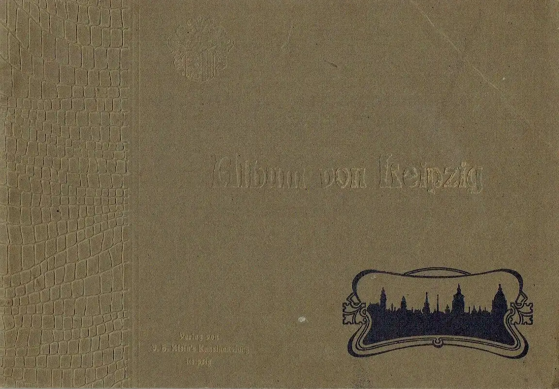 guter bis sehr guter Zustand, geringe Gebrauchs- und Alterungsspuren: Deckel mit Knick an der oberen Ecke, auch ist die Schrift- und Musterfarbe auf dem Deckel überwiegend abgerieben - Bildtafeln sauber und ordentlich - auf der Rückseite der letzten Bildtafel wurden 2 kleinere Bilder und innen auf die Rückseite ein großes Foto zusätzlich eingeklebt, Bilder nach Original-Aufnahmen von Eugen Ravenstein Aufnahmen von - Schloss Pleissenburg mit Carl-Tauchnitz-Brücke - Neues Rathaus (damit ist auch die Datierung des Albums gegeben, 1905 wurde das Rathaus fertig gestellt) - Rathaus mit Siegesdenkmal - Augustusplatz mit Mendebrunnen - Neues Theater - Theater mit Schwanenteich - Universitätsbibliothek und Concerthaus - Großer Saal im Concerthaus - Reichsgerichtgebäude - Johannapark mit Lutherkirche - Buchhändlerbörse - Eingang der Grimmaischen Strasse mit Café Français (Wilhelm Felsche) - Inneres der Thomaskirche - Universität (Augusteum) - Universität (Wandelhalle) - Neue Peulinerkirche - Sieges-Denkmal und Bismarck-Denkmal - Palmengarten - zusätzlich eingeklebt: Conservatorium der Musik (in der Platte datiert 1894) und 2 kleinere Aufnahmen aus dem Inneren des Konservatoriums, kartoniert, ca. 29,5 x 20,5, 18 Bildtafeln mit 19 Bildern + 3 zusätzlich eingeklebte Bilder