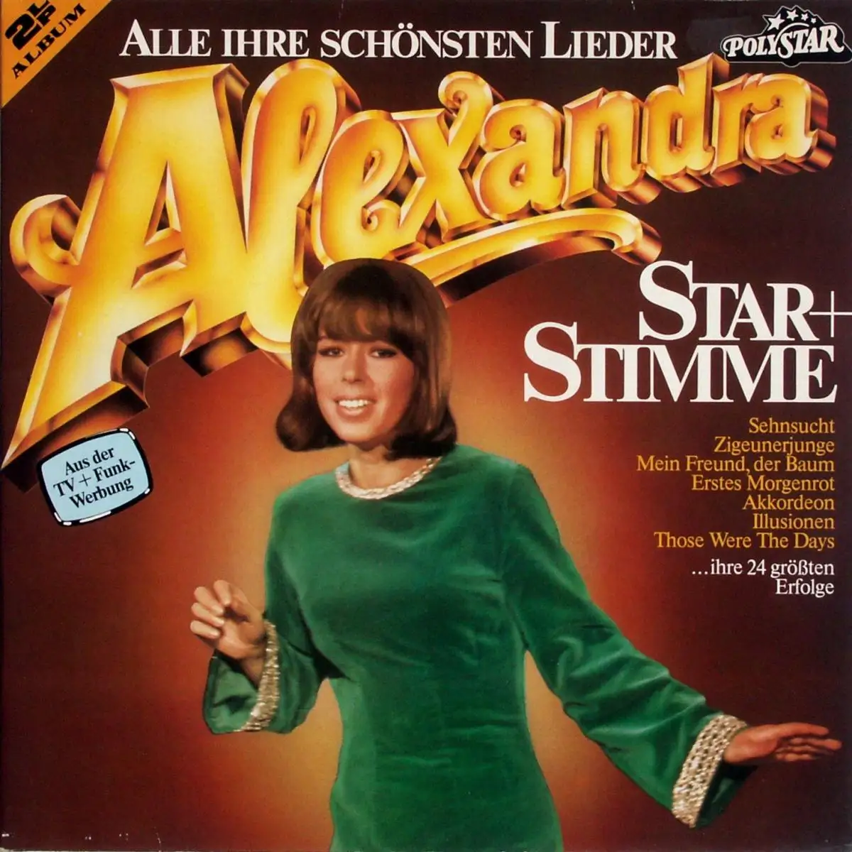 2x LP Album Alexandra - Star + Stimme, Alle Ihre Schönsten Lieder, Zustand Platte M- Hülle M-; Made in Germany 1976 Polystar 6849 009, Tracks Sehnsucht Das Lied Der Taiga 2:53, Das Glück Kam Zu Mir Wie Ein Traum Mañha De Carnaval 2:36, Die Zärtlichkeit La Tendresse 2:20, Akkordeon 2:32, Weißt Du Noch? Oltra La Notte 2:45, Illusionen 2:45, Erstes Morgenrot 3:18, Zwei Gitarren Golden Earrings 3:32, Kleine Anuschka 1:57, Walzer Des Sommers Valse D'Été 3:27, Those Were The Days 3:00, Mein Kind, Schlaf Ein 2:37, Zigeunerjunge 3:07, Grau Zieht Der Nebel Tombe La Neige 2:40, Alles Geht Vorüber 2:59, Tanz, Alter Tanzbär 3:06, O Duscha, Duscha 2:35, Schwarze Balalaika 3:08, Was Ist Das Ziel? Les Ballons Rouges 2:57, Der Große Clown 2:32, Ein Leeres Haus 2:50, Aus! 2:38, Mein Freund, Der Baum 3:39, Wenn Die Lila Astern Blühen 1:40