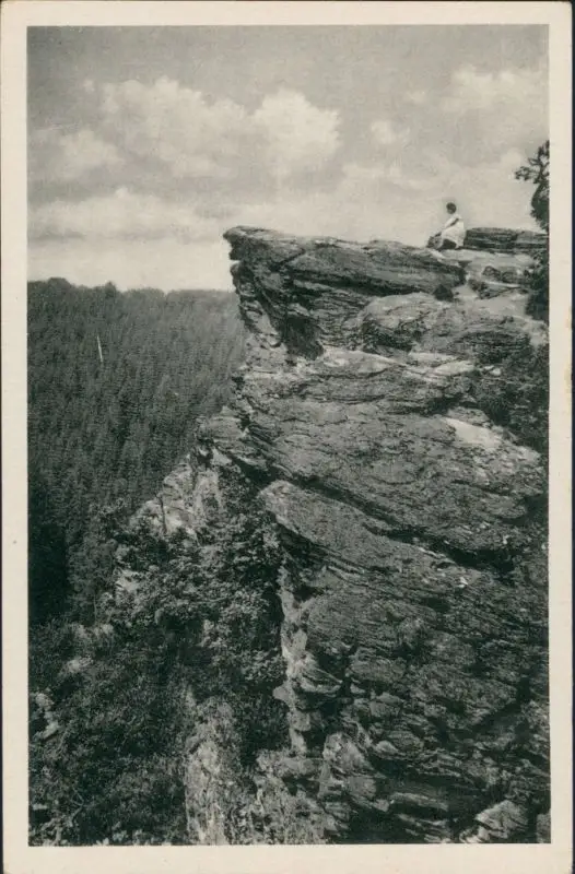 Alexisbad-Harzgerode Umland-Ansicht, Frau auf dem Habichtsstein 1955