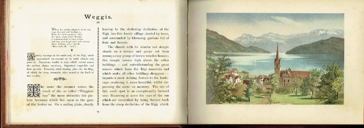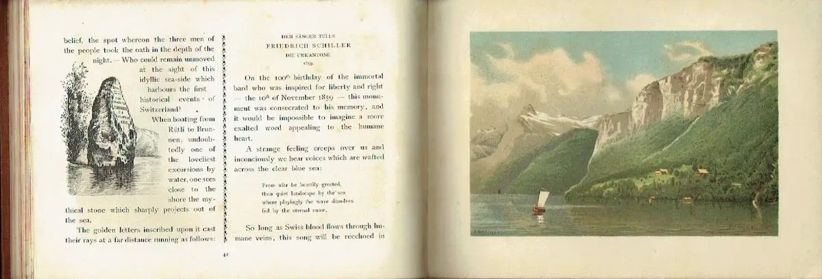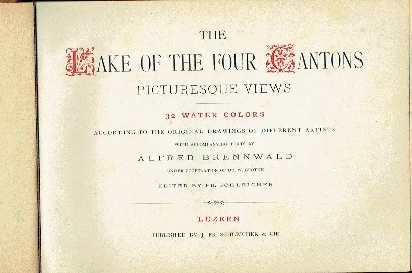 guter Zustand, Gebrauchs- und Alterungsspuren: Bindung fachmännisch erneuert - Seiten überwiegend sauber und ordentlich, selten gering fleckig, die ersten Seiten ein wenig mehr - Textseiten gelegentlich gering knittrig - es fehlen die Seiten 65 bis 80, 32 Water Colors, according to the original drawings of different artists, with Accompanying Texts by Alfred Brennwald under Cooperation of Dr. W. Grothe, edited by Fr. Schleicher Illustratoren waren u. a. W. Hoffmann, A. Schlüter und W. Feldmann - The Lake of Four Cantons - Lucerne - Mount Pilate - The Rigi - Hertenstein - Weggis - Vitznau - Rigi-Känzeli - Beckenried - Gersau - Seelisberg - Brunnen - Axenstein - Frohnalp - Axenstrasse - The Rütli - Tell's chapel - Flüelen - Altdorf - Bürglen - Unterschächen - Amsteg - Maderanerthal - Wasen - The lake of Lowerz - Arth - View from the Pilatus, Leinen, ca. 20 x 14,5, 72 (von 88) Seiten Text mit 25 (von 32) Bildtafeln