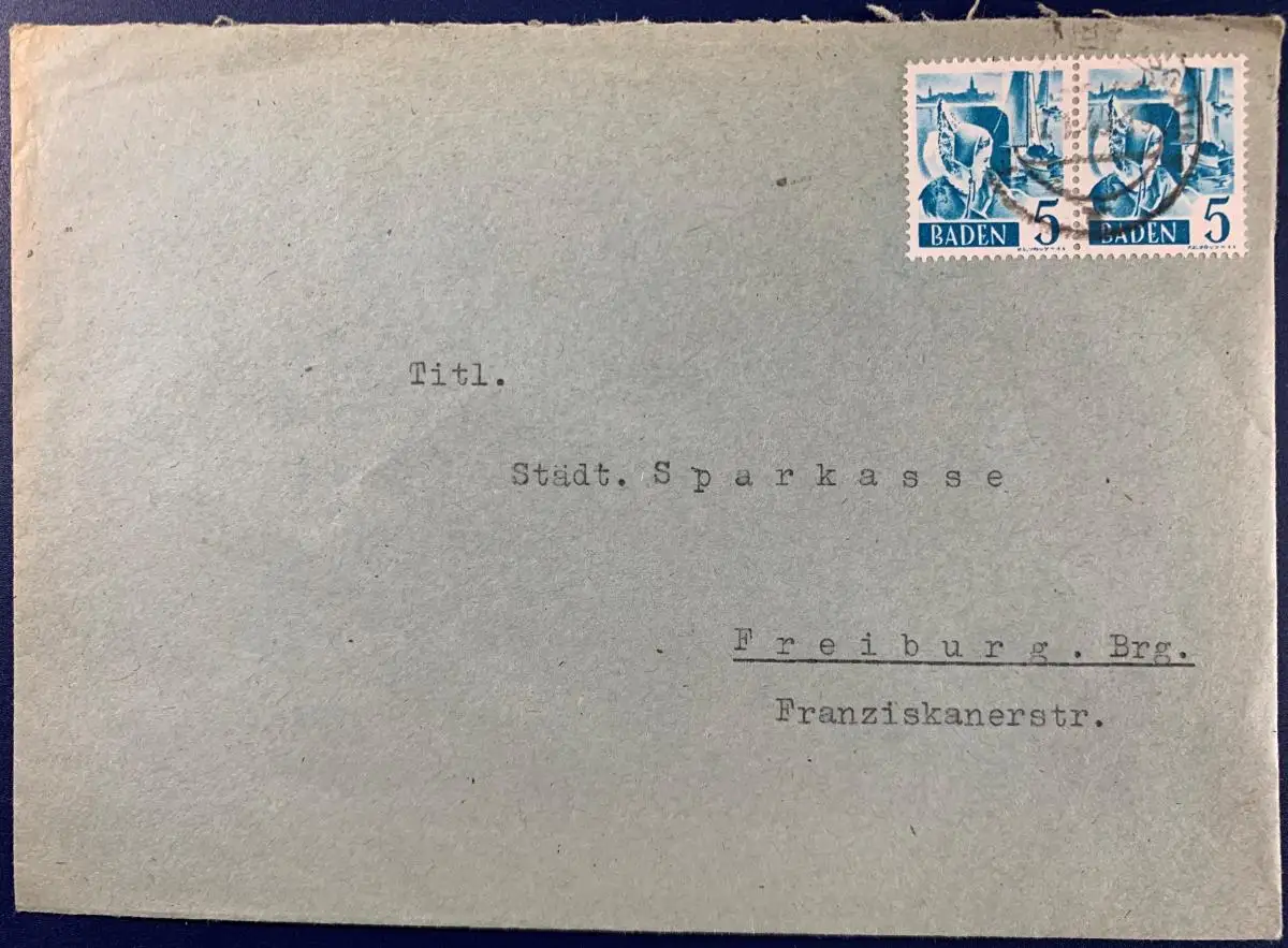 Brief gelaufen mit Poststempel vom 17.?.1949 von ? nach Freiburg/Breisgau, Brief ist sehr gut erhalten.