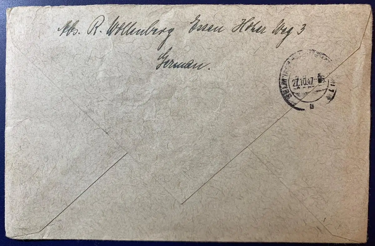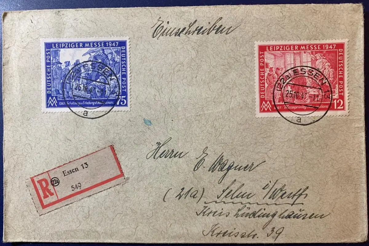 Gelaufen als EINSCHREIBEN mit Poststempel vom 25.10.1947 von Essen nach Selm i. Westfalen.