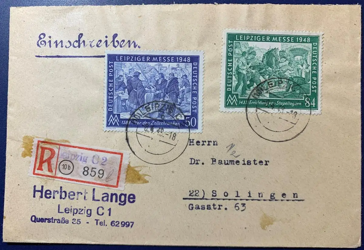 Einschreiben, gelaufen mit Poststempel vom 08.04.1948 von Leipzig nach Solingen.