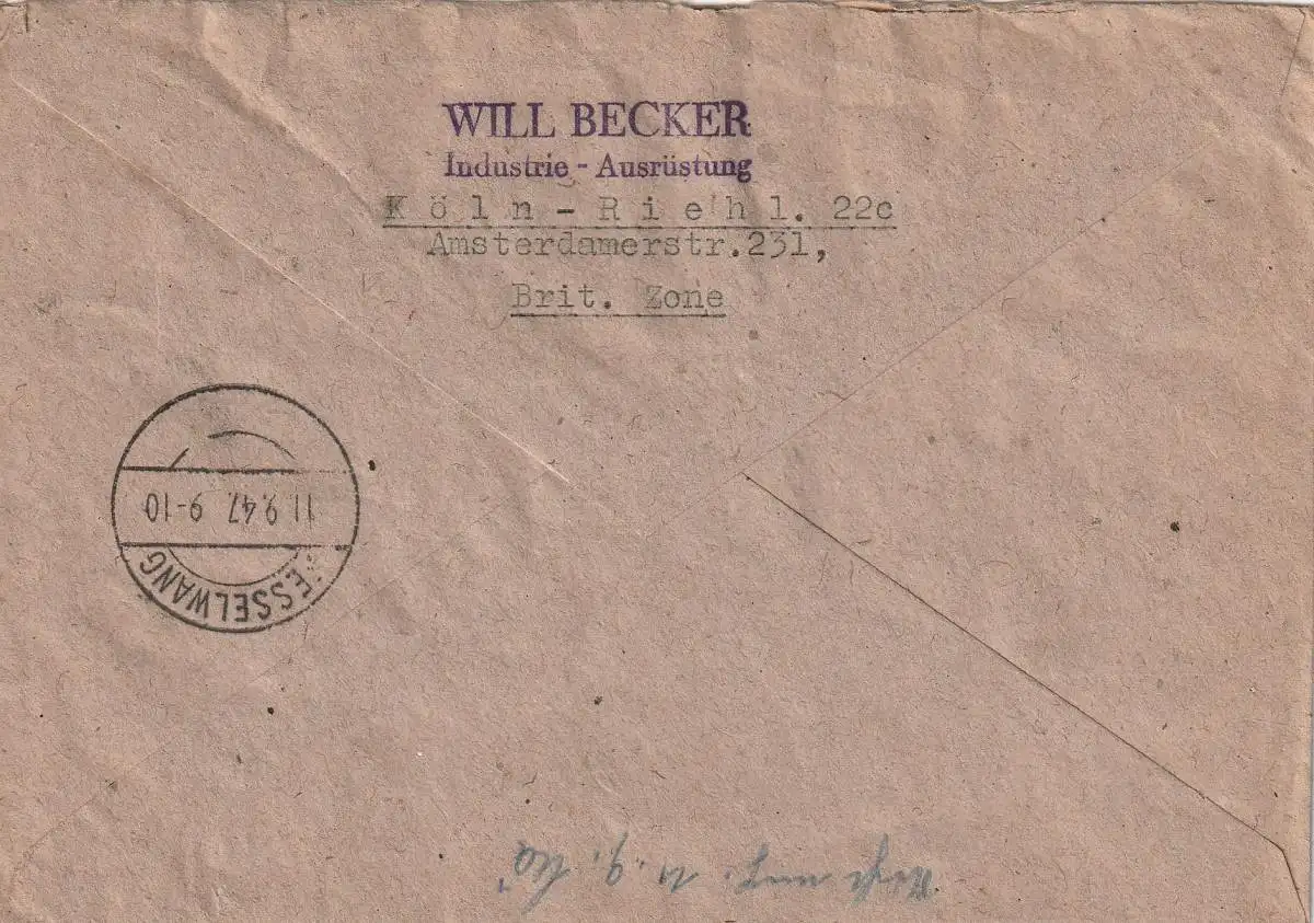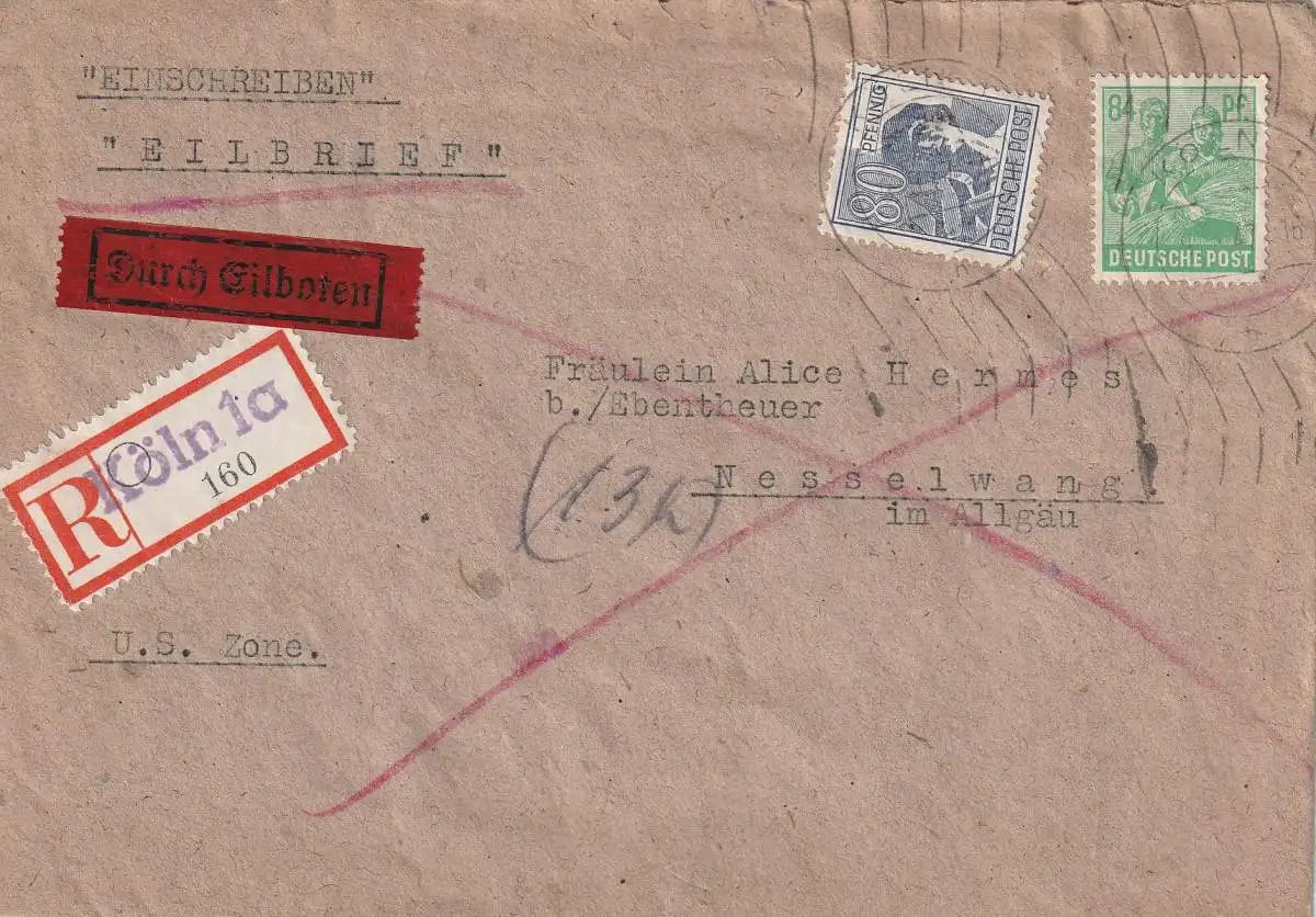 5000 KÖLN, POSTGESCHICHTE 1947, Einschreiben Eilboten Brief nach Nesselwang, Köln 1a Handstempel