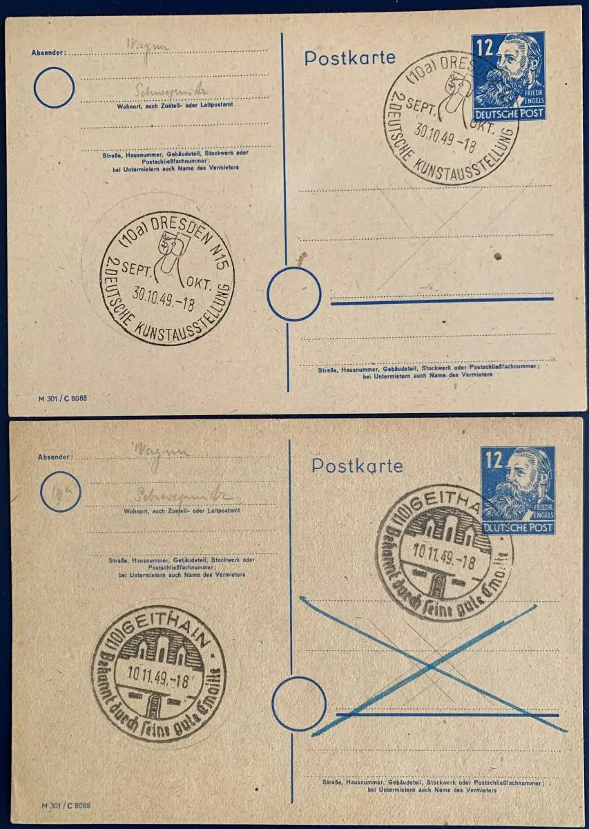 Mi.Nr. P36a/01, entwertet mit schönen Sonderstempeln "2. Deutsche Kunstausstellung Dresden", 30.10.1949 und "Geithain, Bekannt durch seine gute Emaille", 10.11.1949, beide Karten sehr gut erhalten, der Preis gilt für beide Karten!