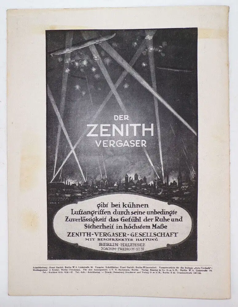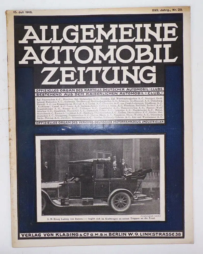 Originale Zeitschrift "Allgemeine Automobil Zeitung Nr 29 von 1916". Format etwas größer als A 4, illustriert, 16 Seiten. Erhaltung: Einband unsauber und fleckig, alles weitere siehe bitte Fotos.