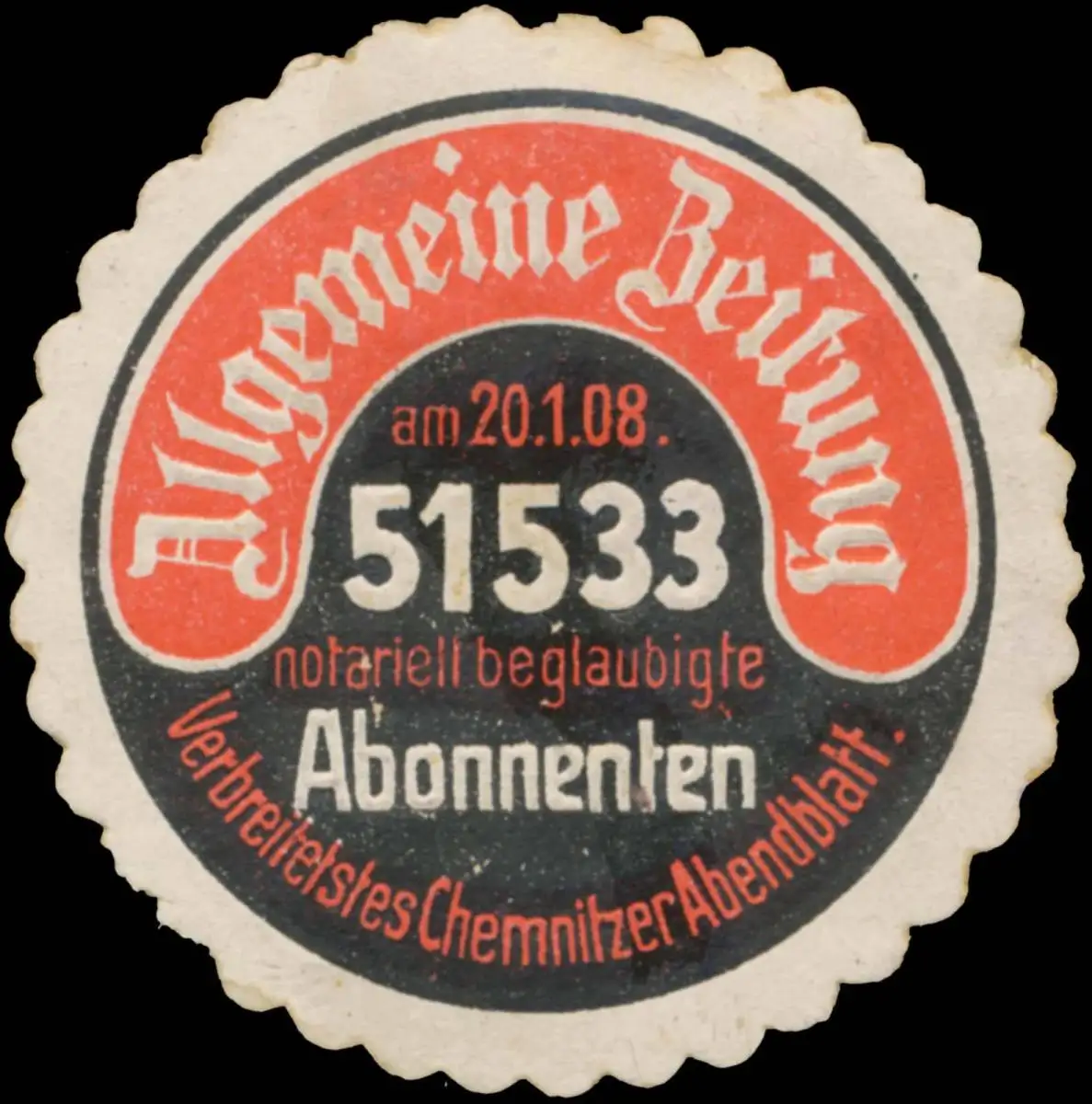 51533 Abonnenten am 29.01.1908, Chemnitzer Abendblatt, Größe/Zustand: 5 , guter Zustand, Original alte Reklamemarke die seinerzeit für die Werbung benutzt wurde
