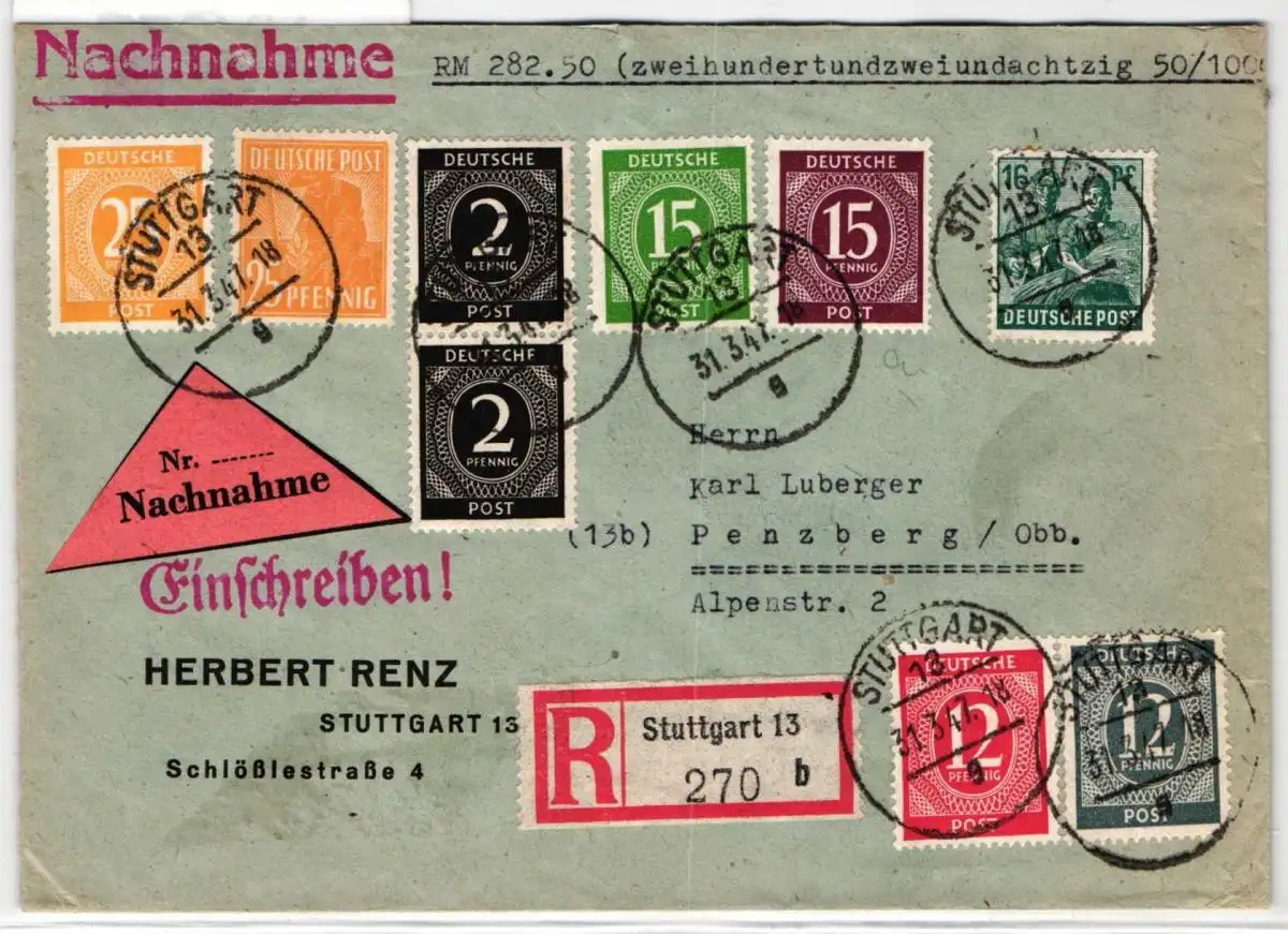 Ziffer- und Arbeiterausgaben am 31.3.1947 auf Einschreiben Nachnahme Ortsbrief portogerecht in Stuttgart gelaufen.