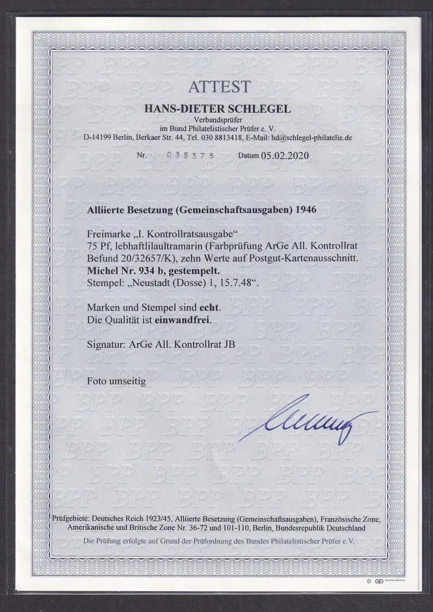 Alliierte Besetzung Mi.-Nr. 934 b (8X), gestempelt, FA. Schlegel BPP.