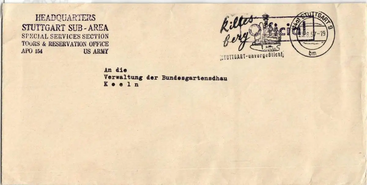 Portofreier Brief US Army von Stuttgart am 23.8.1957 nach Köln gelaufen.