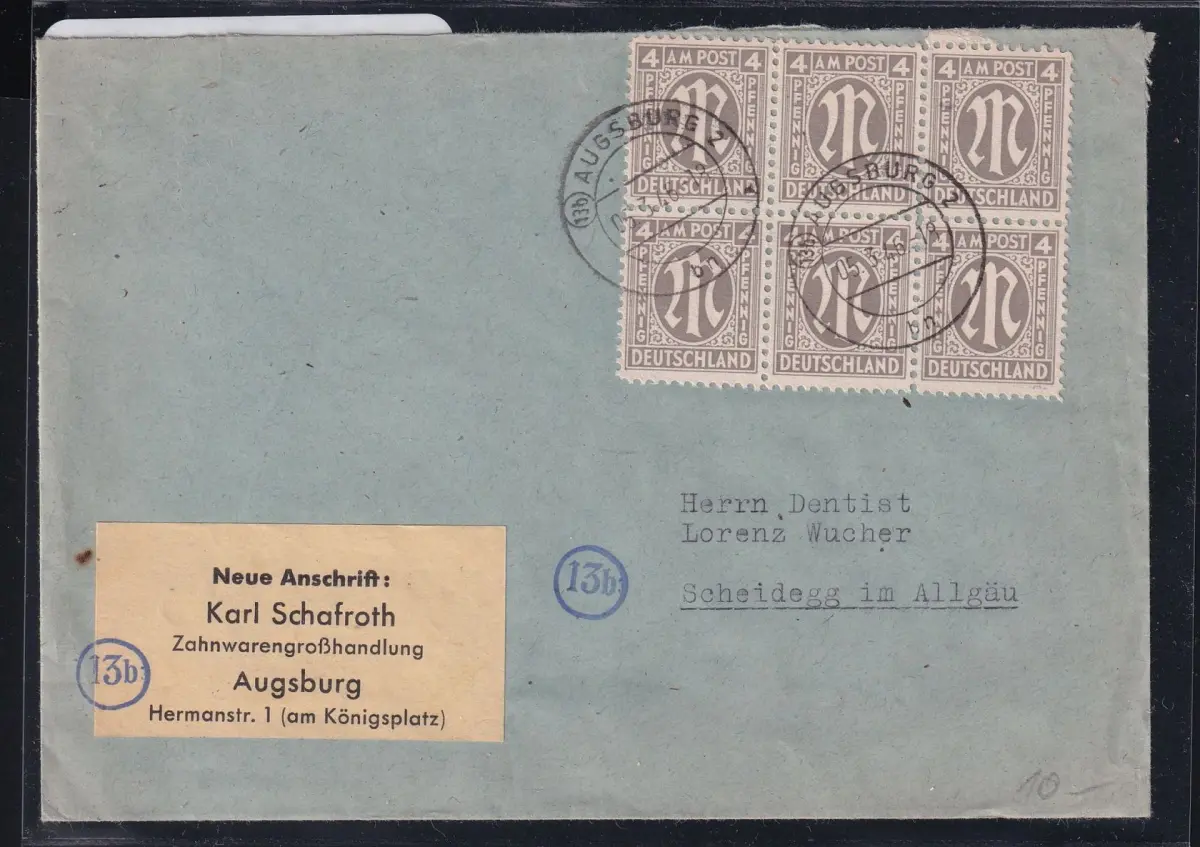 4 Pfennig Freimarke M im Oval Bizone auf Fernbrief portogerecht am 5.3.1946 von Augsburg nach Scheidegg im Allgäu gelaufen.