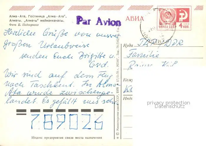 Alma-Ata_Almaty Hotel Alma-Ata Alma-Ata Almaty postalisch gelaufen nach 1965 Erhaltung siehe scans [DarjaD84] DarjID84