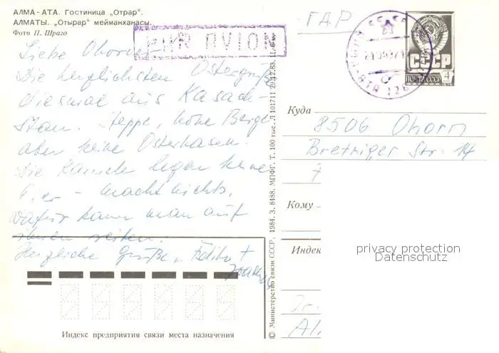 Almaty Hotel Otrar Almaty postalisch gelaufen nach 1965 Ganzsache (eingedruckte Briefmarke) Erhaltung siehe scans [NatalD47] Ganzsache (eingedruckte Briefmarke) NataID47