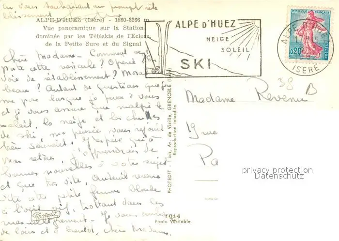Alpe_d_Huez_Isere Vue panoramique sur la Station dominee par les Teleskis de l'Ecole Alpe_d_Huez_Isere postalisch gelaufen 1962 Erhaltung siehe scans [WerneD78] WernPID7