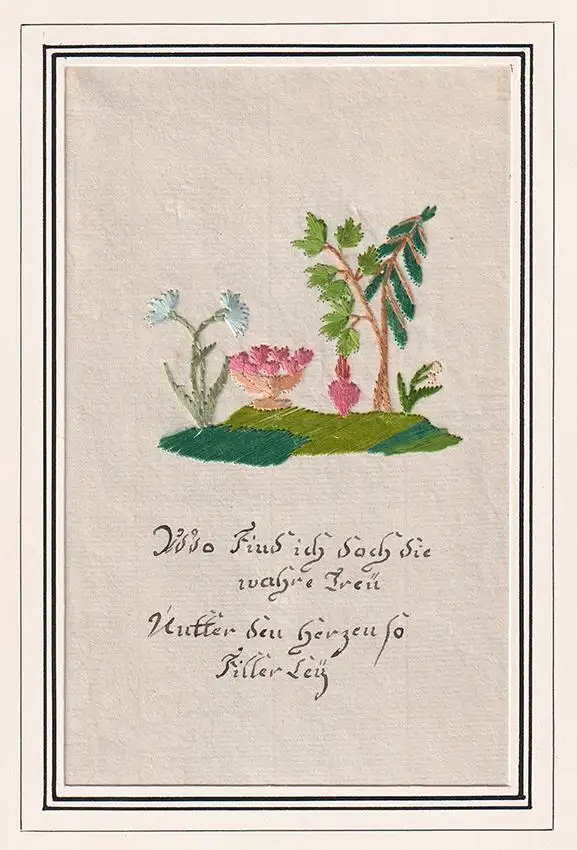 o. O. [spätes 19. Jahrhundert]. Stickerei und schwarze Tinte auf Büttenpapier. 16, 3 x 10, 2 cm. (Blattgr.). Gut erhalten.