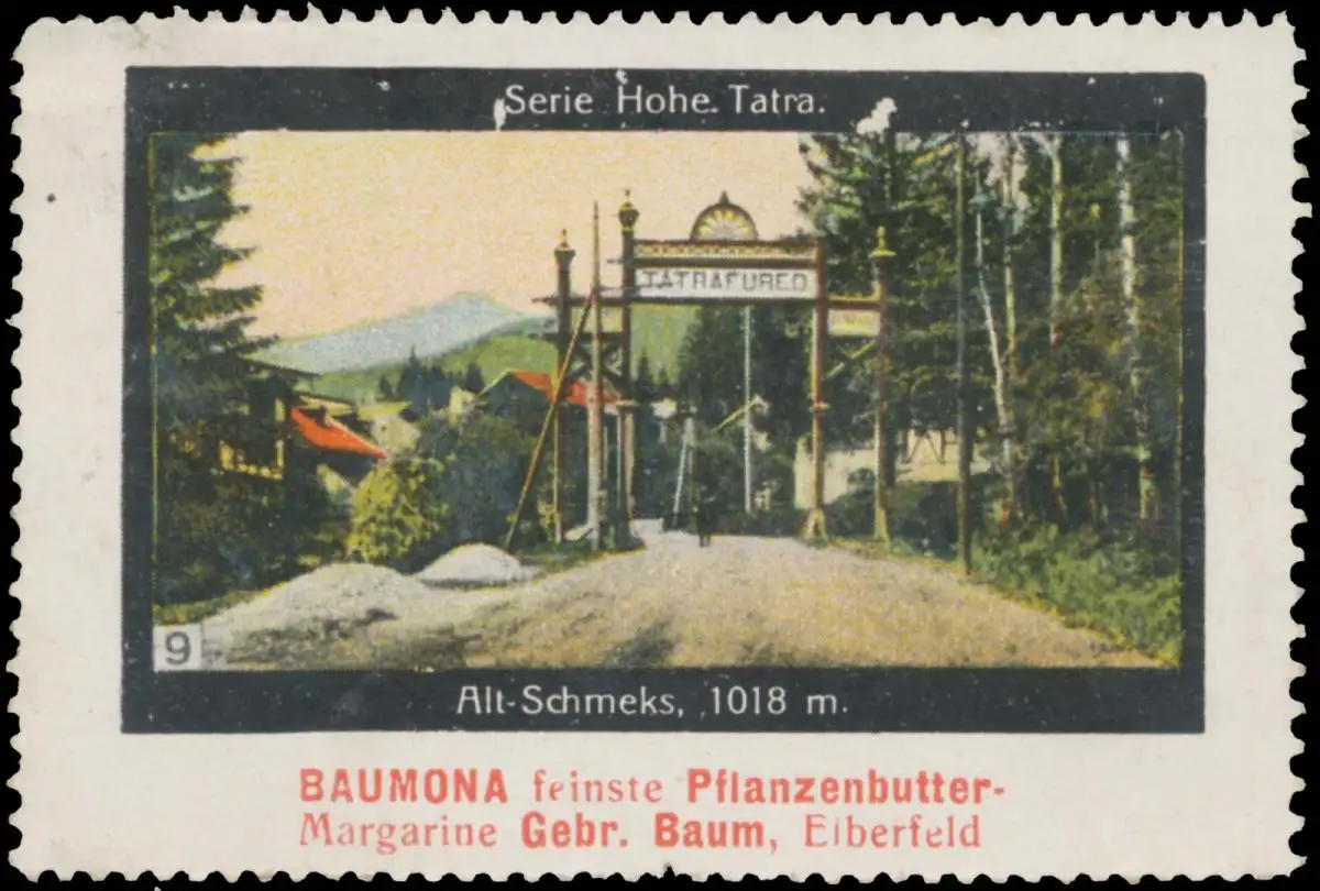Serie Hohe Tatra, Bild 9, Baumona feinste Pflanzenbutter-Margarine, Wuppertal, Größe/Zustand: 4x7 , beschädigt, Original alte Reklamemarke die seinerzeit für die Werbung benutzt wurde
