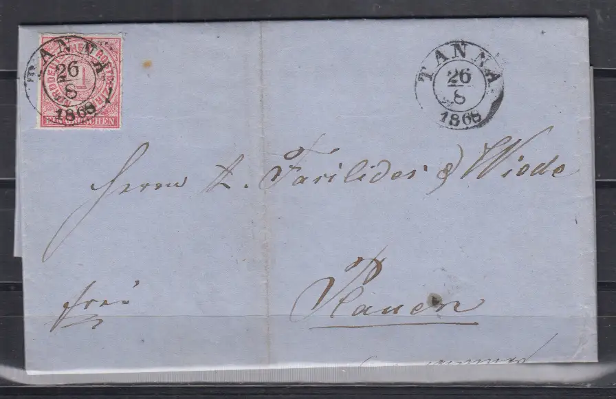 seltener Thurn+Taxis-o TANNA 26.8.1868 in Nachverwendung auf kpl. Faltbrief Nordd.Bund EF 4, innen Lacksiegel und rückseitig Ausgabe-o