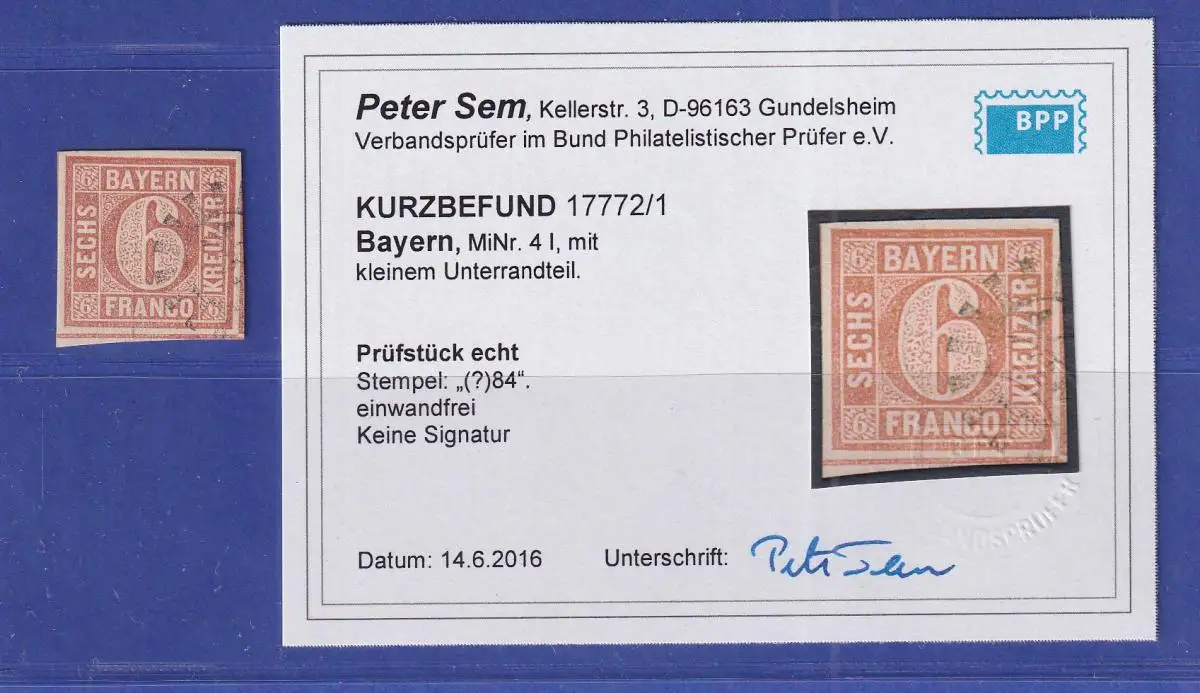 Altdeutschland Bayern 6 Kreuzer Mi.-Nr. 4 I gestempelt, KB SEM BPP