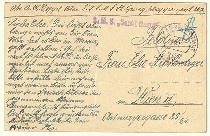 Bemerkungen: Gelaufen m. Stempel: S.M.S. "Sankt Georg" Einzeiler violett KALIS5-P.20 neben K.u.K, EtappenPA 267/29. VIII. 16 - Albanien Armeegruppen-Kommando.