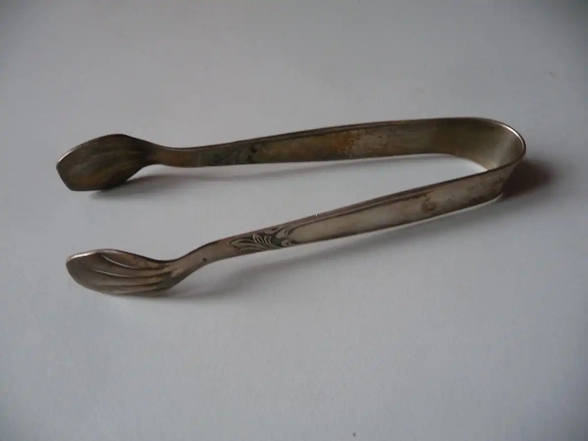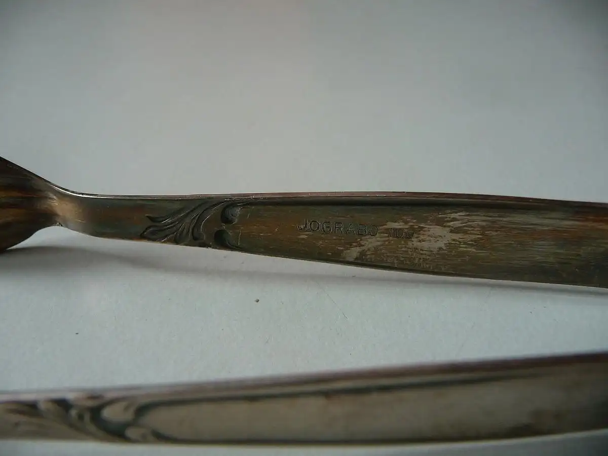 Alte Zuckerzange mit Reliefdekor, innen geprägt "Jograbo 100" Länge ca. 10,5 cm Oberflächen etwas fleckig / angelaufen, sonst gut erhalten.