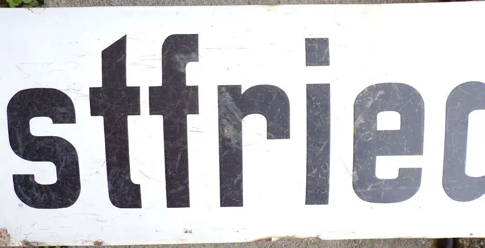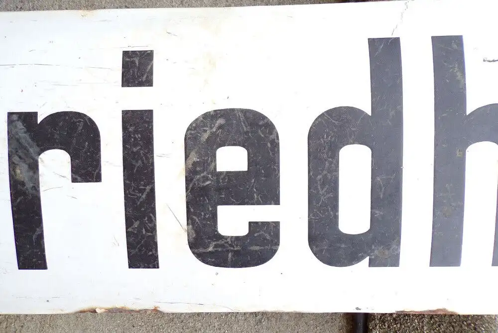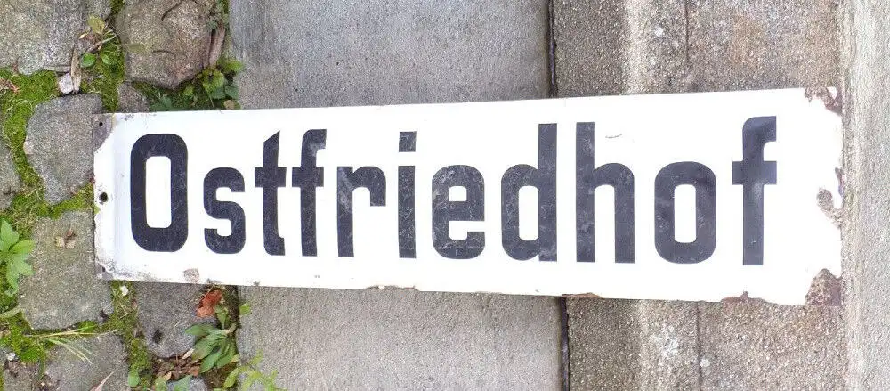 Originales, altes Emailschild. Ostfriedhof. Maße: 99,5 cm x 24 cm. Erhaltung: Emailleabschläge und Patina vorhanden, vorhanden, ansonsten gut, alles weitere siehe bitte Fotos.