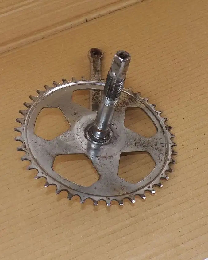 Originales Kettenblatt, mit Achse. 44 Zähne. Durchmesser ca. 18,5 cm. Achslänge: 11,5 cm ( das was raus schaut ). Vierkantmaß Achse: 1,3 x 1,3 cm, Länge der Pedalstange: 19,5 cm. Erhaltung: Gebrauchsspuren, Farbabriebe und Patina vorhanden, ansonsten gut, alles weitere siehe bitte Fotos.