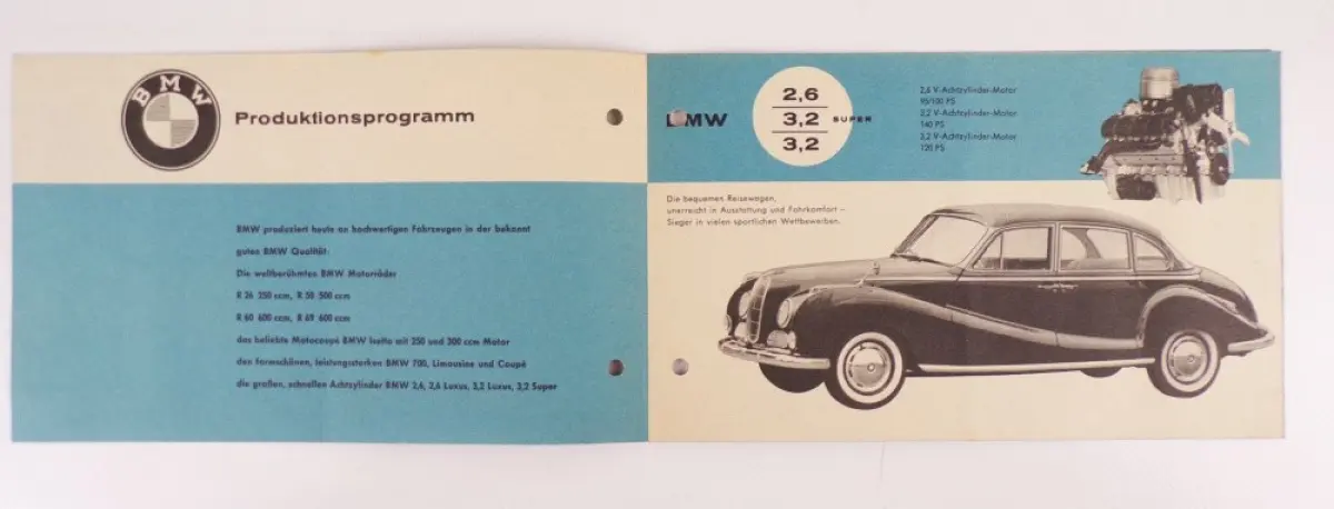 Originales Prospekt BMW Isetta 2,6, 3,2, 700, R26, R50, R60, R69. Querformat: 20,5 x 12,5 cm. 12 Seiten, aufklappbar. Erhaltung: gelocht, Titel mit Stempel, ansonsten gut, alles weitere siehe bitte Fotos.