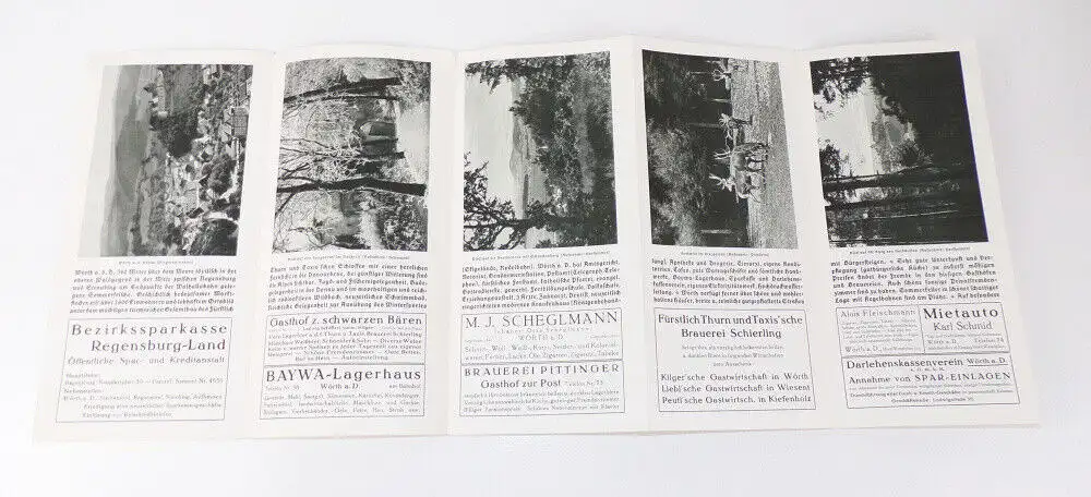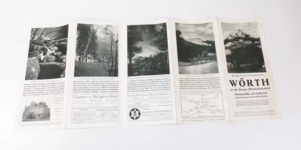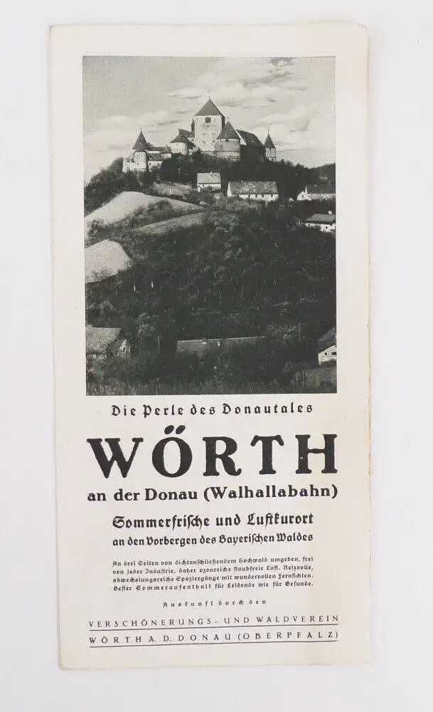 Jeweils 1 Prospekt, Die Perle des Donautales Wörth an der Donau ( Walhallabahn ), Sommerfrische und Luftkurort. Ca. um 1930. Format: 11 x 23 cm, 10 Seiten, aufklappbar. Erhaltung: gebrauchter, guter Zustand, alles weitere siehe bitte Fotos.