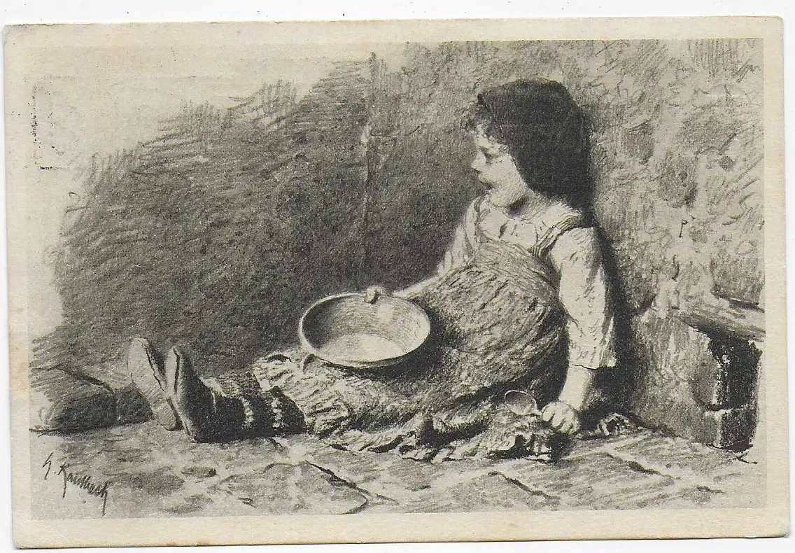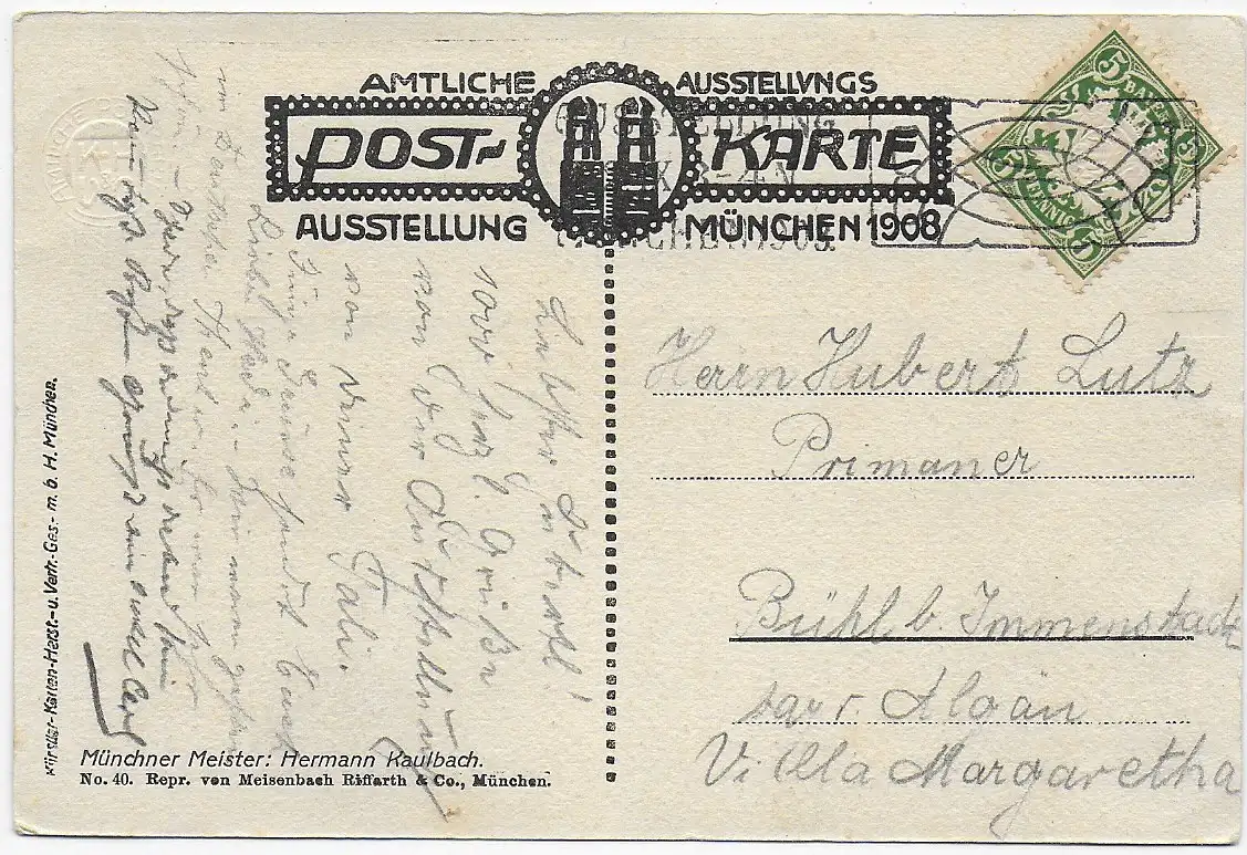 Amtliche Ausstellungskarte München, 1908: bettelndes Kind, Kaulbach