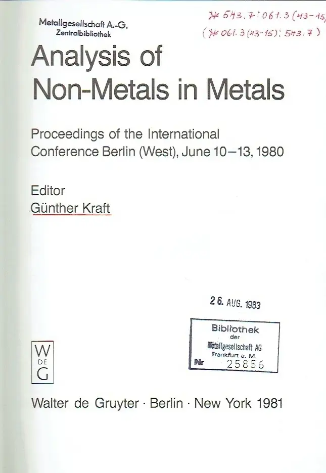 Analysis of Non-Metals in Metals Proceedings of the International Conference Berlin (West) ... 1980.