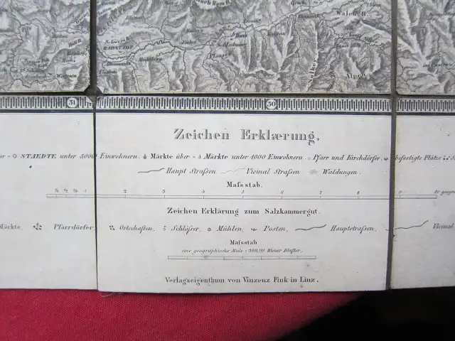 Linz : Vinzenz Fink, o. J, Faltkarte mit 15 Segmenten [Land Enns 8 Segm., Ansicht Salzkammergut 2 Segm., Salzkammergut 2 Segm., Legende 5 Segm.] 39,5x56 cm aufgeklappt, 16x11 cm gefaltet, auf braunen Leinen gezogene Karte.