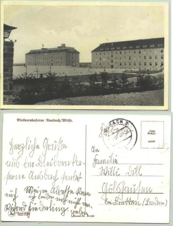 Ansbach Kaserne 1940 (intern : 1009408) Artikelbeschreibung u. Zustand : Siehe Scan. Weitere Infos : Alte Ansichtskarte "Bleidornkaserne Ansbach / Mitfr.". PLZ-Bereich 91522. Beschrieben u. postalisch gelaufen mit Feldpost 1940