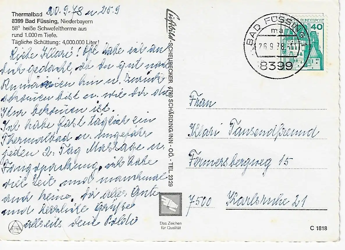 Ansichtskarte Bad Füssing - Thermalbad - gelaufen 1978