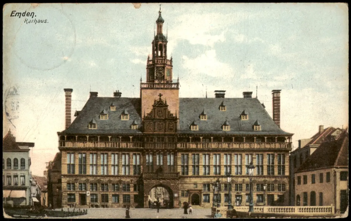 Infos: Kolorierte Ansichtskarte (Autotypie) des historischen Emder Rathauses. Die Abbildung zeigt die prächtige Renaissance-Fassade des Gebäudes mit dem markanten Turm und dem davorliegenden Rathausplatz mit Staffagefiguren. Erschienen im Verlag Ottmar Zieher, München, Seriennummer J. 16.