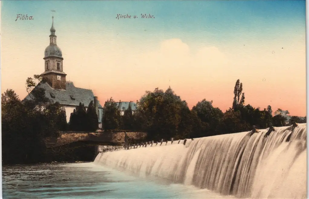 Ansichtskarte Flöha (Sachsen) Kirche und Wehr - coloriert 1912