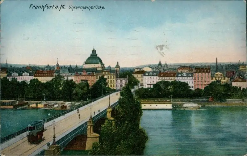 Ansichtskarte Frankfurt am Main Untermainbrücke mit Straßenbahn 1918