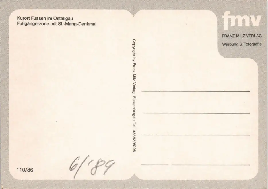 Ansichtskarte Füssen Fußgängerzone mit St.-Mang-Denkmal 1986