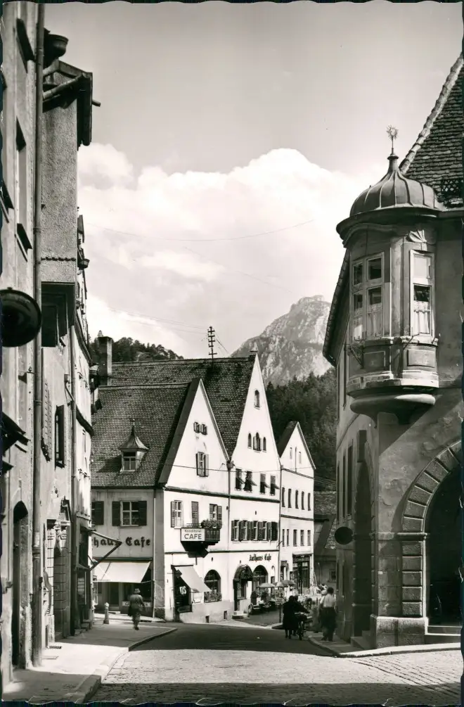 Ansichtskarte Füssen Lechhalde Rathaus Strassen Partie Café 1960