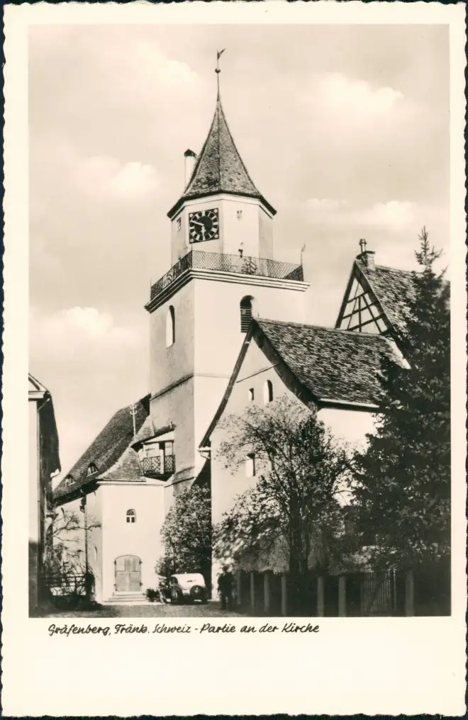 Ansichtskarte Gräfenberg Strassen Partie a.d. Kirche, altes Auto 1955