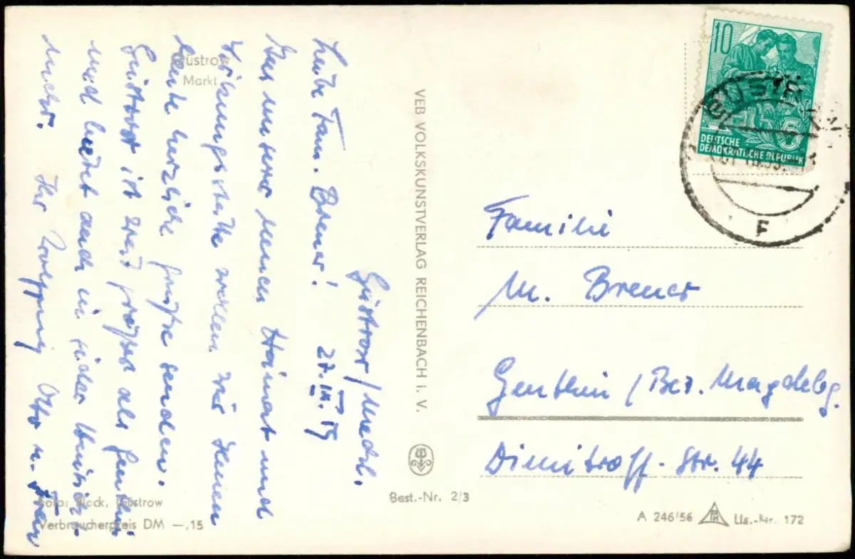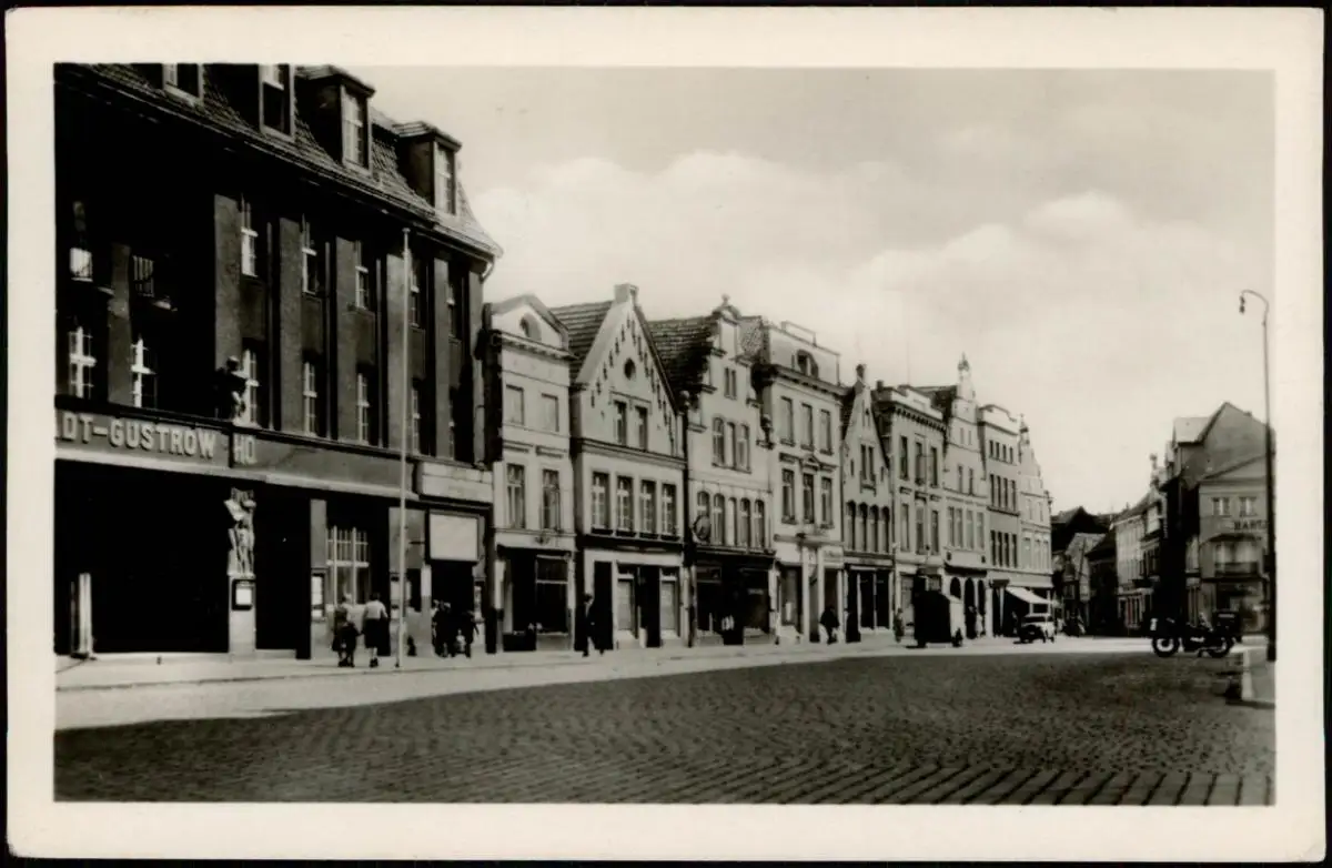 Ansichtskarte Güstrow Marktplatz, Geschäfte 1956