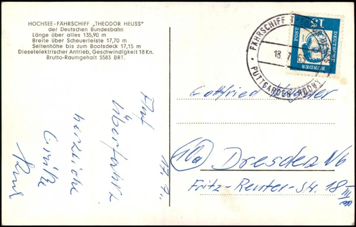 Ansichtskarte HOCHSEE-FÄHRSCHIFF THEODOR HEUSS Dampfer Steamer 1963 Bordstempel