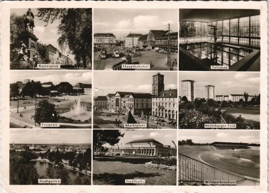 Ansichtskarte Karlsruhe Kaiserplatz, Tullabad, Mühlburger Feld 1958