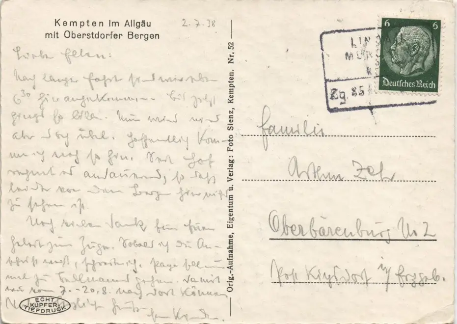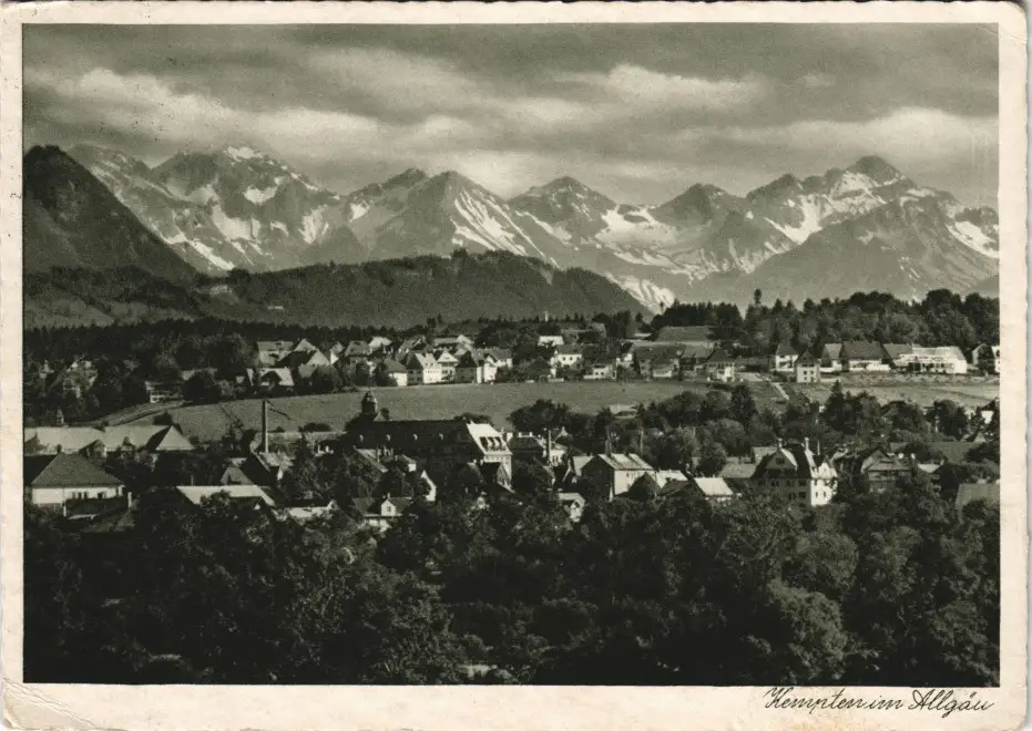 Ansichtskarte Kempten (Allgäu) Stadt fel. Bahnpost 1936