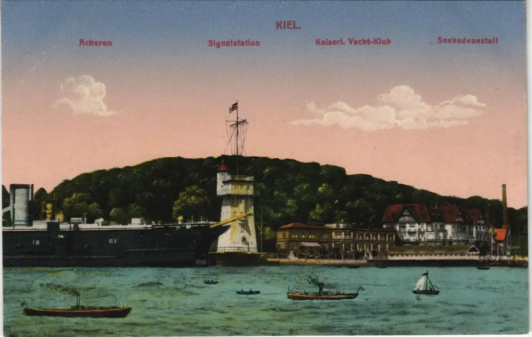 Ansichtskarte Kiel Acheron Signalstation Seebadeanstalt 1914