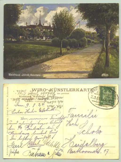 (1021687) Konstanz 1924. Ansichtskarte. WIRO-Kuenstlerkarte. Waldhaus Jakob. PLZ-Bereich pauschal 78465. Bahnpoststempel
