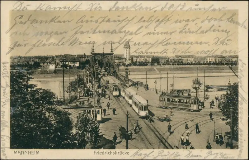 Ansichtskarte Mannheim Friedrichsbrücke, Straßenbahn 1931
